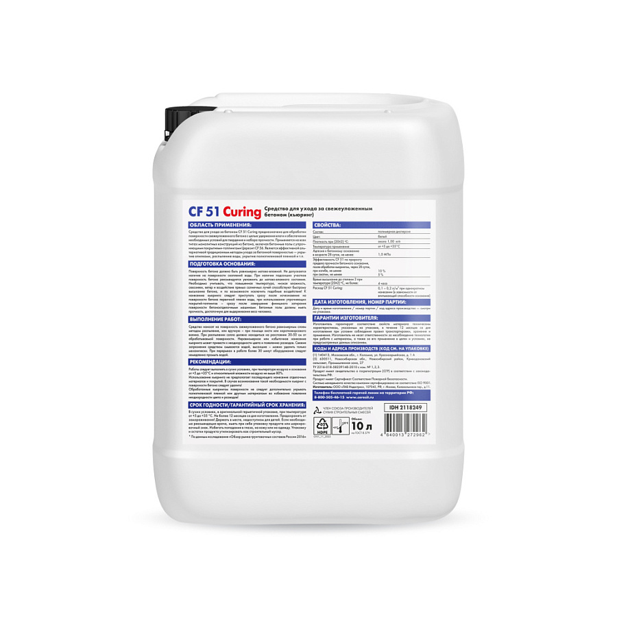 Ceresit CF 51 Curing - это эффективное средство для ухода за свежеуложенным бетоном. Оно предназначено для создания оптимальных условий для затвердевания бетона, предотвращая его быстрое высыхание. Специальная формула Ceresit CF 51 Curing образует защитную пленку на поверхности бетона, которая сохраняет влагу и предотвращает появление трещин и деформаций. Это надежное средство обеспечит долговечность и прочность вашей бетонной конструкции.